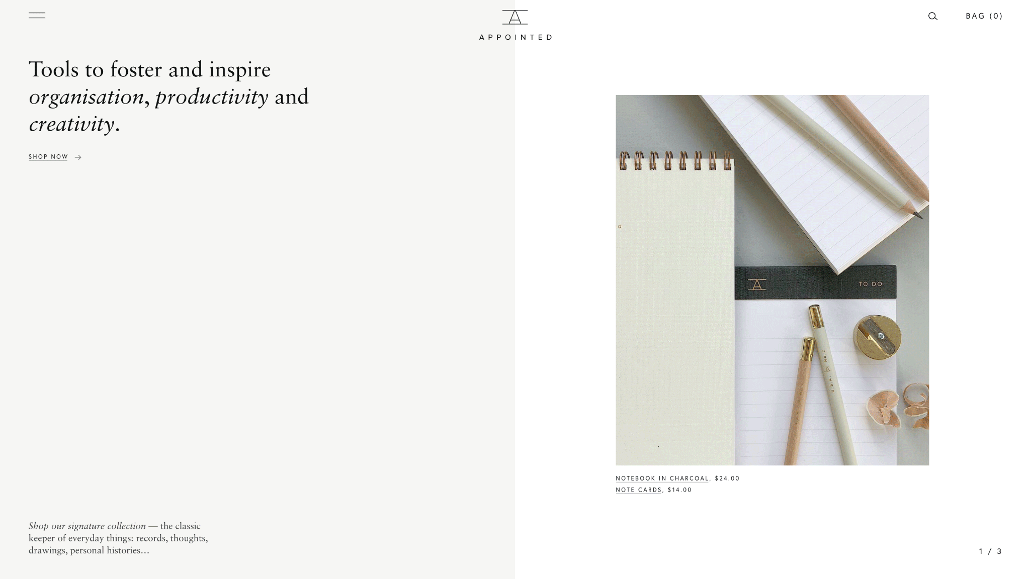 The team at Appointed approached us to create a fully custom e-commerce experience that inspired and would reflect the growth the brand after establishing themselves as an international brand, with a reputation for refined and premium work and stationery products.