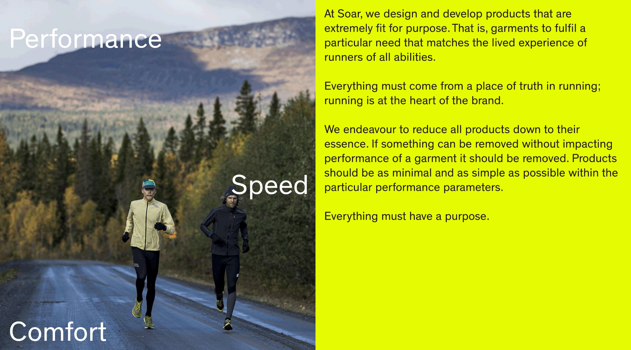 Widely regarded within the industry, Soar endeavours to reduce all products down to their essence. Each aspect of their engineered running wear has a clear purpose, differentiating their products from others, as a fashionable and functional activewear brand.